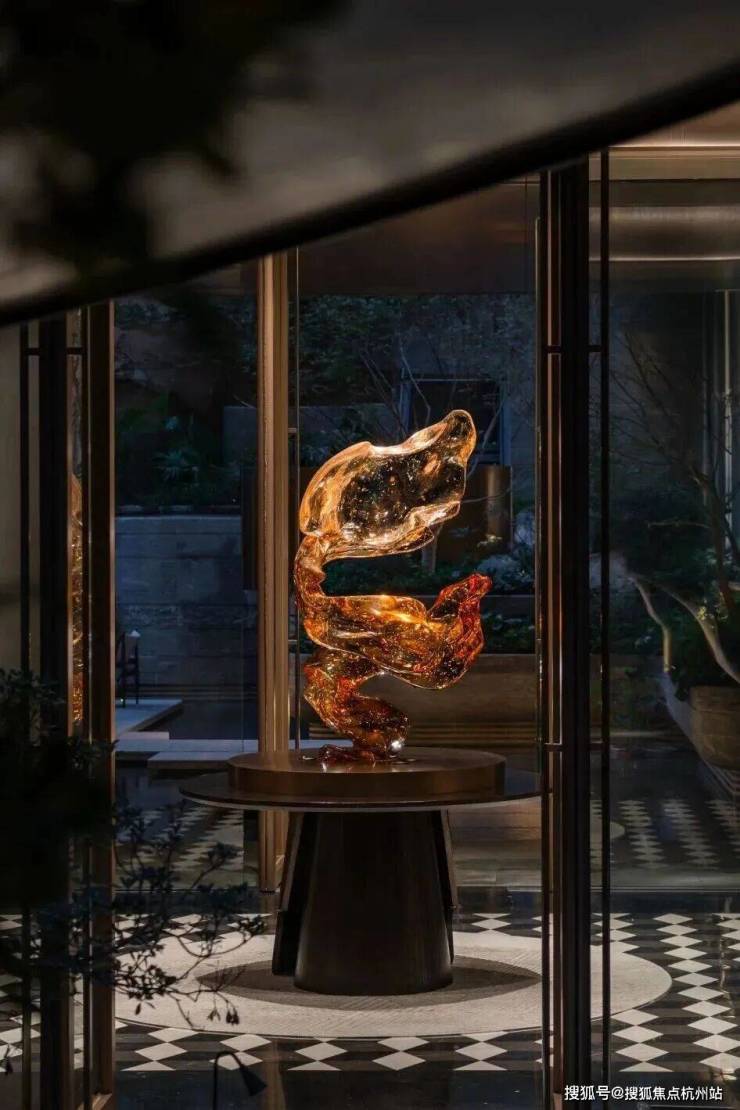 如山茶花般的定制石雕,映衬厚重的朱氏铜门,配上两侧大面荷塘月色奢石、铂金钻石材景墙,远远望去,宛如歌剧开幕时垂坠的天鹅绒帷幔,打开归家的仪式感。