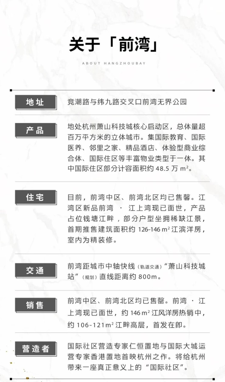 本宣传资料所载全部内容仅供参考均不构成要约和项目建设标准,一切以政府规划及批准文件为准,对项目周边环境、交通、教育、商业及其他配套设施的介绍旨在提供相应信息,不排除因政府规划、政策规定及出卖人未能控制的原因而发生变化,不意味着本公司对此作出了承诺。款式以交付样板为准。本宣传物料所展示装修优化方案仅供装修参考,非交付标准,开发商对此不作任何承诺。本公司保留对宣传资料修改的权利,敬请留意较新宣传物料,制作日期:2020年7月。开发商【杭州科昇&科谊房地产开发有限公司】。本项目备案名为江上湾,推广名为前湾·江上湾,预售证号为萧售许字2020第00574号。本文部分图片来源网络,如有侵权,请联系删除。