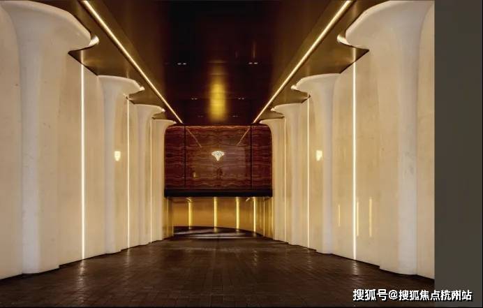 门庭延街的外立面,以精工定制弧形米色石材为主调,镶嵌典藏级老虎玉大理石,点缀古铜色现代海派艺术感灯器,整体呈现出百年海派的贵雅气质。