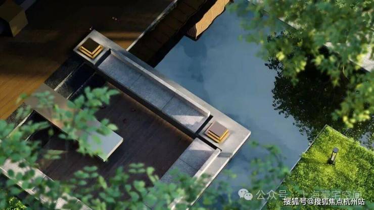 经典三段式别墅立面及大窗墙比,实现居住与自然的延伸;中灰色石材为基座,奢石宁静与土地矜贵互为映衬。中灰色石材的厚重感,深灰色铝板的舒展度,“安缦金”高奢质感勾勒边框,与蓝眼睛光面石砖、冰花蓝光面石材的交织下,呈现出“天光云影”的意境。