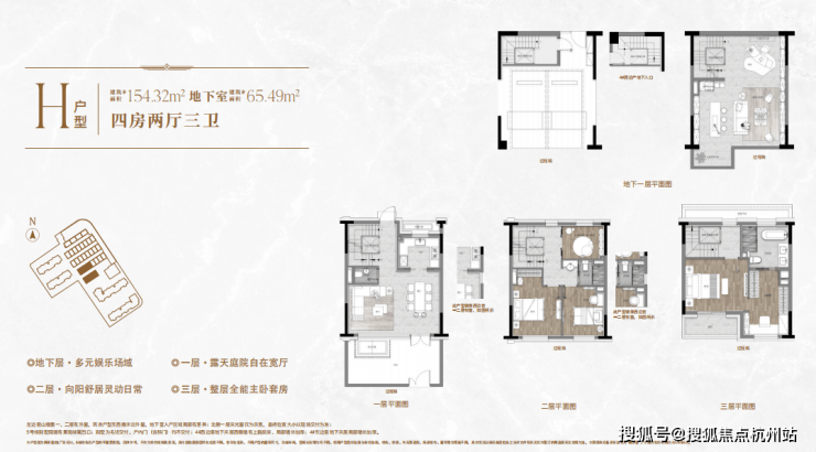 一楼和地下室主社交和志趣,二楼是子女的房间,三楼是主人休憩区。