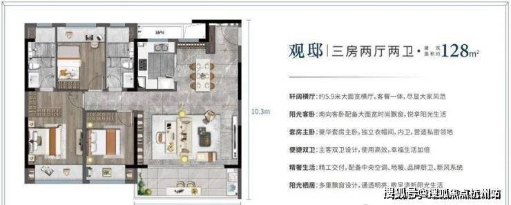 精研建筑面积约108-142㎡全明户型,全屋大飘窗、宽景大阳台、南向大开间、私密主卧套,空间实用与美观兼备,超高得房率与附加值,满足多样家庭功能需求