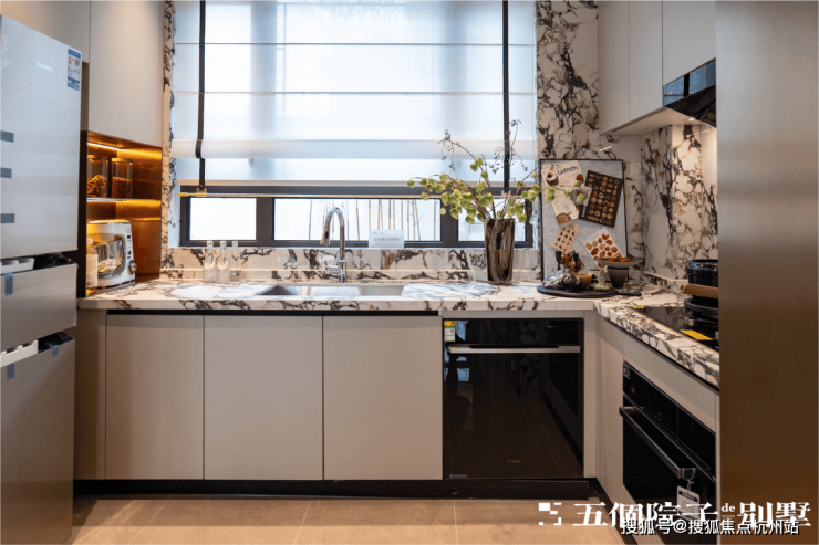 厨房U型操作台面,操作便捷,并预留了双开门冰箱位置。