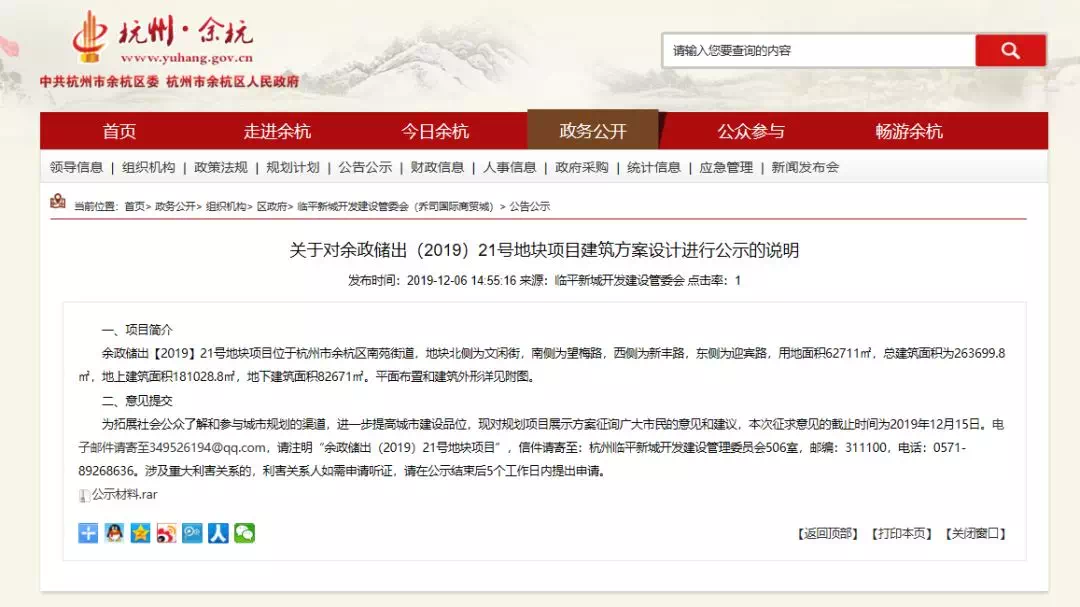 12月6日,总体量超26万方的临平新城地标项目滨耀城建筑方案对外公示!