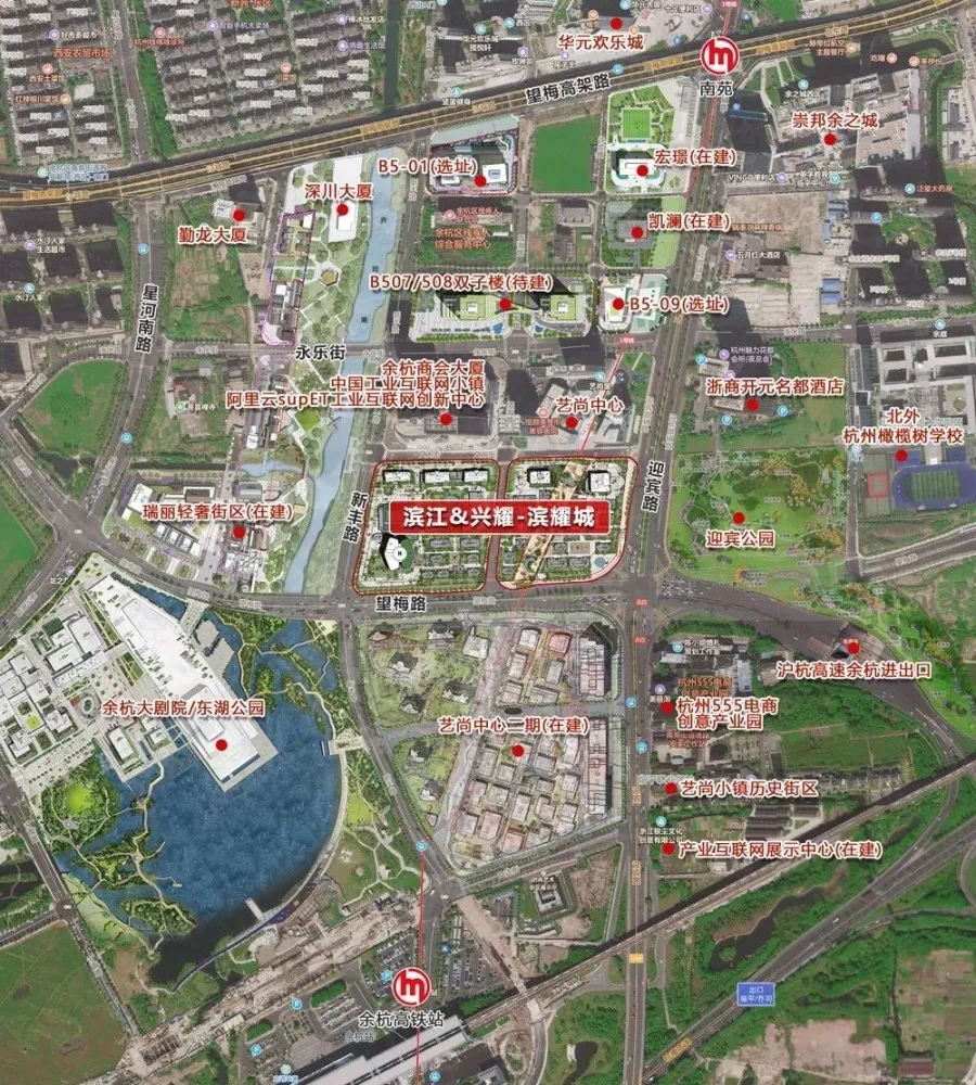 滨耀城位于临平新城核心区入城口的望梅路与迎宾路西北处,北侧为文闲街,南侧为望梅路,西侧为新丰路,东侧为迎宾路,用地面积62711㎡,总建筑面积为263699.8㎡,地上建筑面积181028.8㎡,地下建筑面积82671㎡。