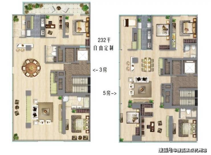 以232㎡面积产品为例,既可以做成3房也可以做成5房, 全看用户灵活定制要求。追求简约艺术风格的话,你要做成大平层2房甚至1房也可以 , 留下空间来室内滑板或开卡丁车!