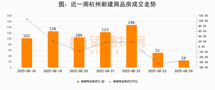 根据杭州市住房保障和房产管理局数据显示,2025年08月24日杭州新建商品房成交24套,较昨日减少27套,环比下降52.9%。近一周杭州新建商品房日均成交97套。08月24日单日成交24套,低于近一周平均水平75.3%。