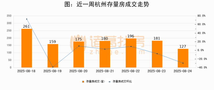 从存量房来看,2025年08月24日杭州存量房单日成交127套,比昨日减少54套,环比下降29.8%。从近一周存量房成交来看,杭州存量房日均成交套数为182套,08月24日单日成交127套,低于近一周平均水平30.2%。