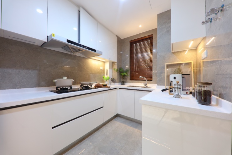 以建面约99m²终极三房为例,考虑实际生活中,厨房台面总是越用越拥挤,宸宇府运用巧妙设计,在深U型厨房打造出约4.05米操作台面,远超市面普通3米台面。更难得的是,宸宇府还精打细算,预留出了双开门冰箱空间,简直堪称“惊艳”!