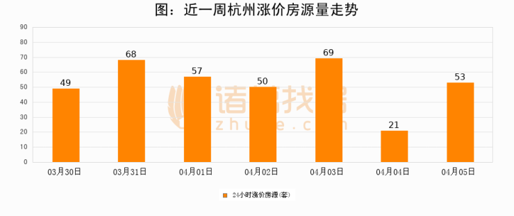 根据诸葛找房数据显示,杭州24小时涨价房源量为53套,较04月04日增加32套,环比上涨152.4%。与此同时,涨价房源占比小幅扩大,业主信心有所提升。