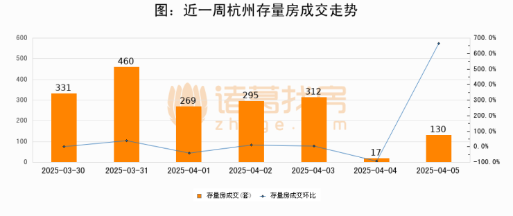 从存量房来看,2025年04月05日杭州存量房单日成交130套,比昨日增加113套,环比上涨664.7%。从近一周存量房成交来看,杭州存量房日均成交套数为259套,04月05日单日成交130套,低于近一周平均水平49.8%。