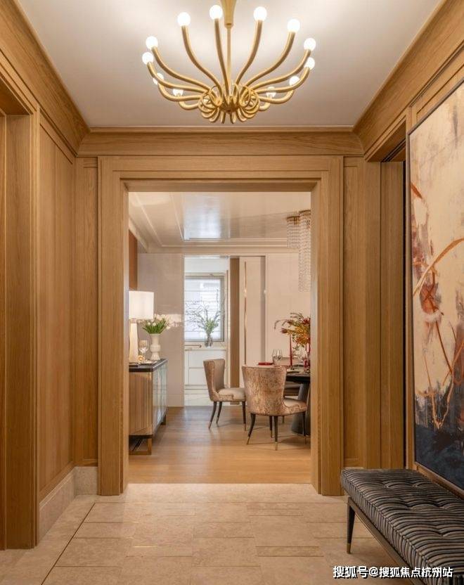 硬装上以木饰面和米色石材做结合,物料原始肌理感,表达经历时间后的沧桑痕迹。大理石地面镶嵌精致金属条,保留材质的原始感,木饰面配柔和灯光,调和出安宁澄澈的归家氛围。