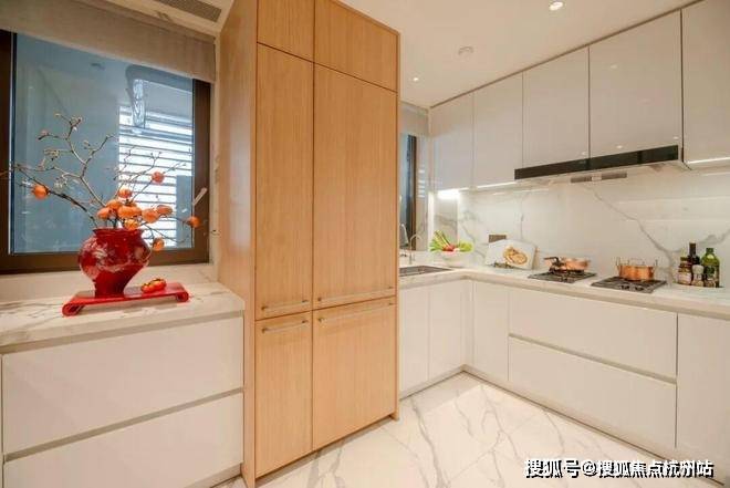 厨房采用洄游式立体布局,一半是“工作厨房”,隐于内部的中式厨房,有效避免油烟外泄,无论烹炸煎烤,空间之外清新依旧。