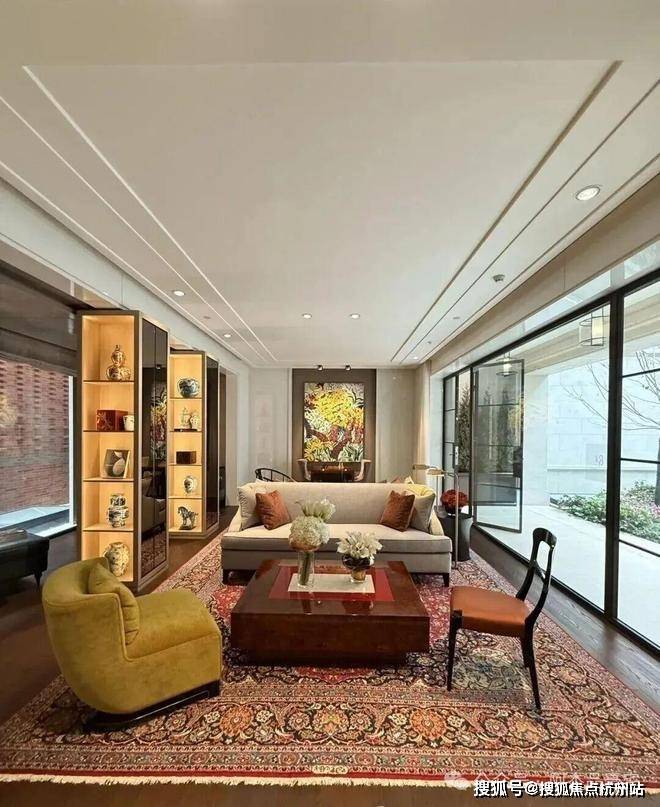 正式的大沙发区域,灵活散座区域,家具注重收藏种类多样性,中式圈椅,西式小沙发,灵活移动,根据需求可聚可散。手工编织的复古羊毛波斯地毯,用植物和矿物天然染料来进行染色,拥有了抗衡时间侵蚀的美,更增加了收藏的丰富性,是高品味的体现。