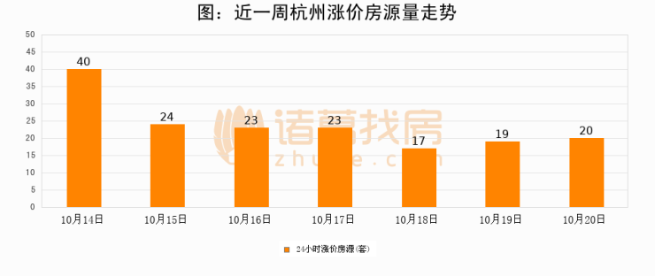 根据诸葛找房数据显示,杭州24小时涨价房源量为20套,较10月19日增加1套,环比上涨5.3%。与此同时,涨价房源占比小幅扩大,业主信心有所提升。