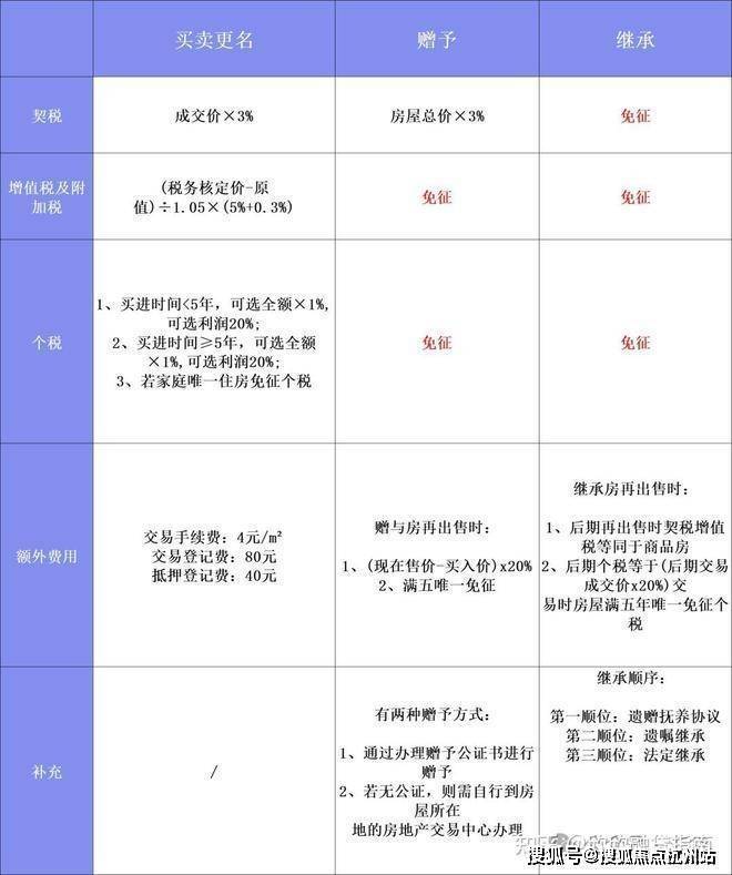赠与:直系亲属赠与免增值税/个税,受赠方按3%全额缴纳契税;非直系赠与税费更高买卖:按正常交易缴纳增值税、契税、个税(标准同上)