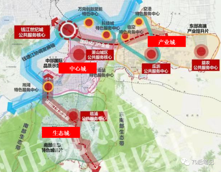 萧山较新的规划中,萧山被划成了三块,分别是东部产业城,中部的中心城,以及南部的生态城。