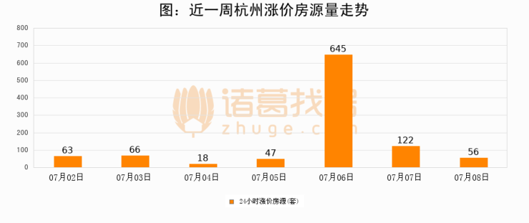 根据诸葛找房数据显示,杭州24小时涨价房源量为56套,较07月07日减少66套,环比下降54.1%。与此同时,涨价房源占比小幅回落,对于购房者来说是一个入市窗口期,购房者可抓住时机入市。