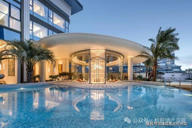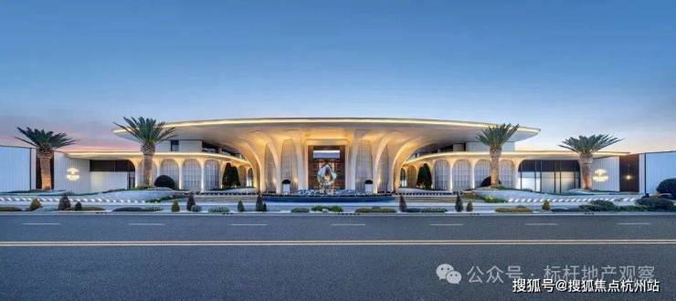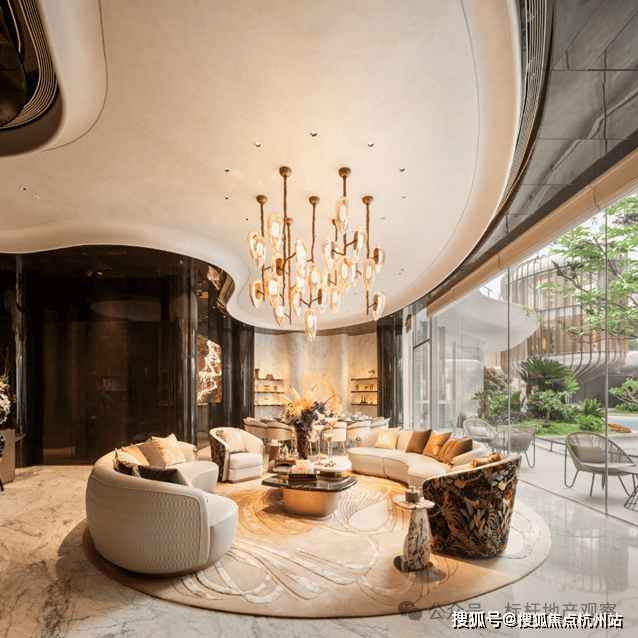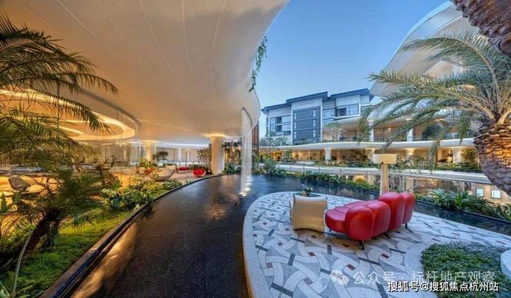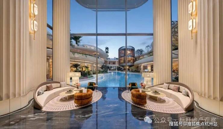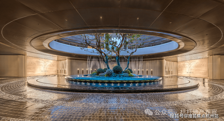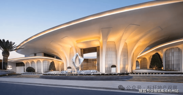 元序打造三折柔美弧线勾勒“垂直竹节”立面,兼具未来感与中式韵味。光环门廊拥有超百米宽、近11米的挑高,两侧约8米加纳利海枣与约5米塔形罗汉松,一眼望去豪奢气势。