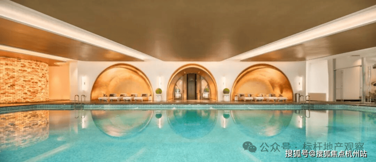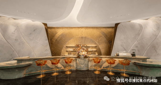 不止于此,元序还花费重金做到奢石满配:中央车马厅层墙面局部采用雪花白奢石,池壁为巴西利亚黑奢石,池底铺进口黑金砂,溢水台面选用“绿野仙踪”奢石,大堂月光米黄石材,有些地面铺上了太古黑金石材,蓝水晶石材背景墙…