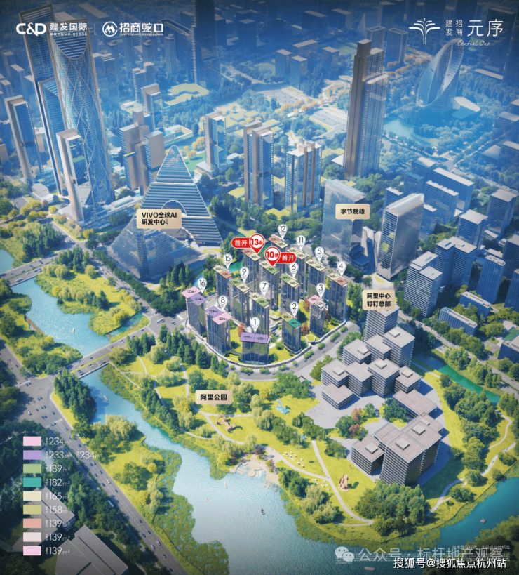 元序所在地块是未来科技城自出让以来,地段最佳一宗宅地,集结了文体地标、百亿商圈、科创总部、公园河景等城市资源。北侧为字节华东中心(刚投入运营),西侧为VIVO全球AI研发中心(在建,幕墙基本完成),西北侧为钉钉总部(已运营),南侧为河道和沿河阿里公园。