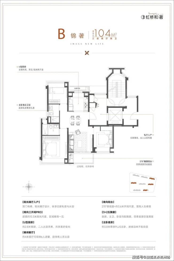 建面约104㎡3房,在建面94㎡小3房优点上,又进一步升级了尺度感,约10.3m的南向面宽,为室内带来了出众的采光面和尺度感,这个户型无论从实用性、尺度感,亦或是视野、采光、私密性来说,都做得相当优秀。
