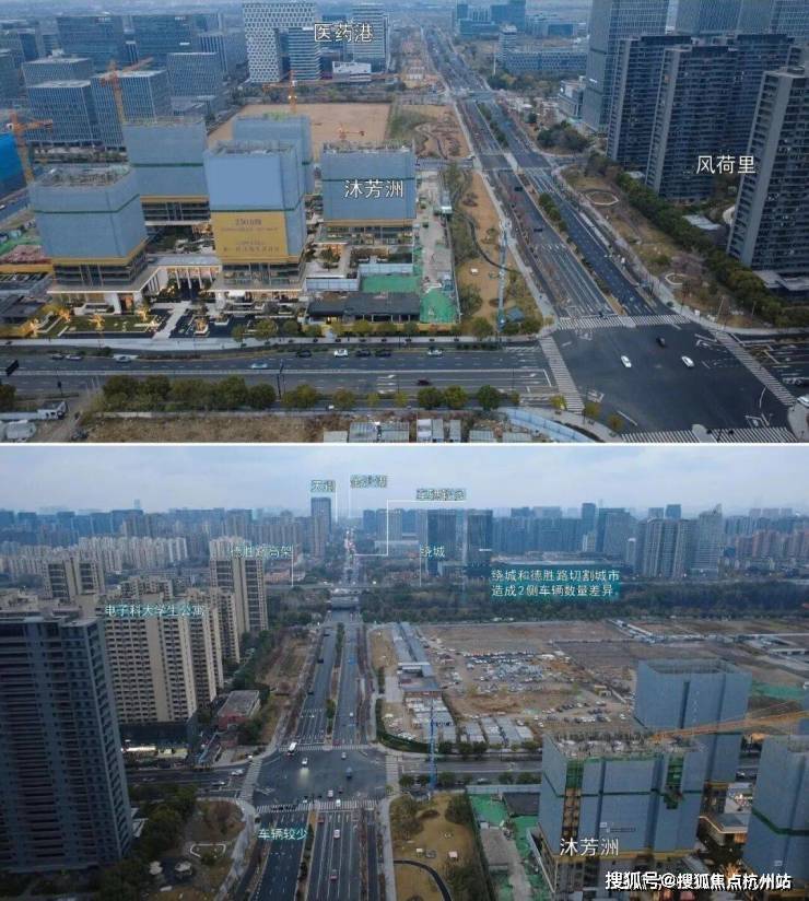 沐芳洲位于钱塘区医药港小镇板块,周边有风荷里、天街金沙湖等项目。但项目东侧紧邻德胜快速路,西侧靠近绕城高速,两条主干道如同“剪刀”一般将地块切割,导致两侧车流量差异明显,项目所在侧车辆相对较少。
