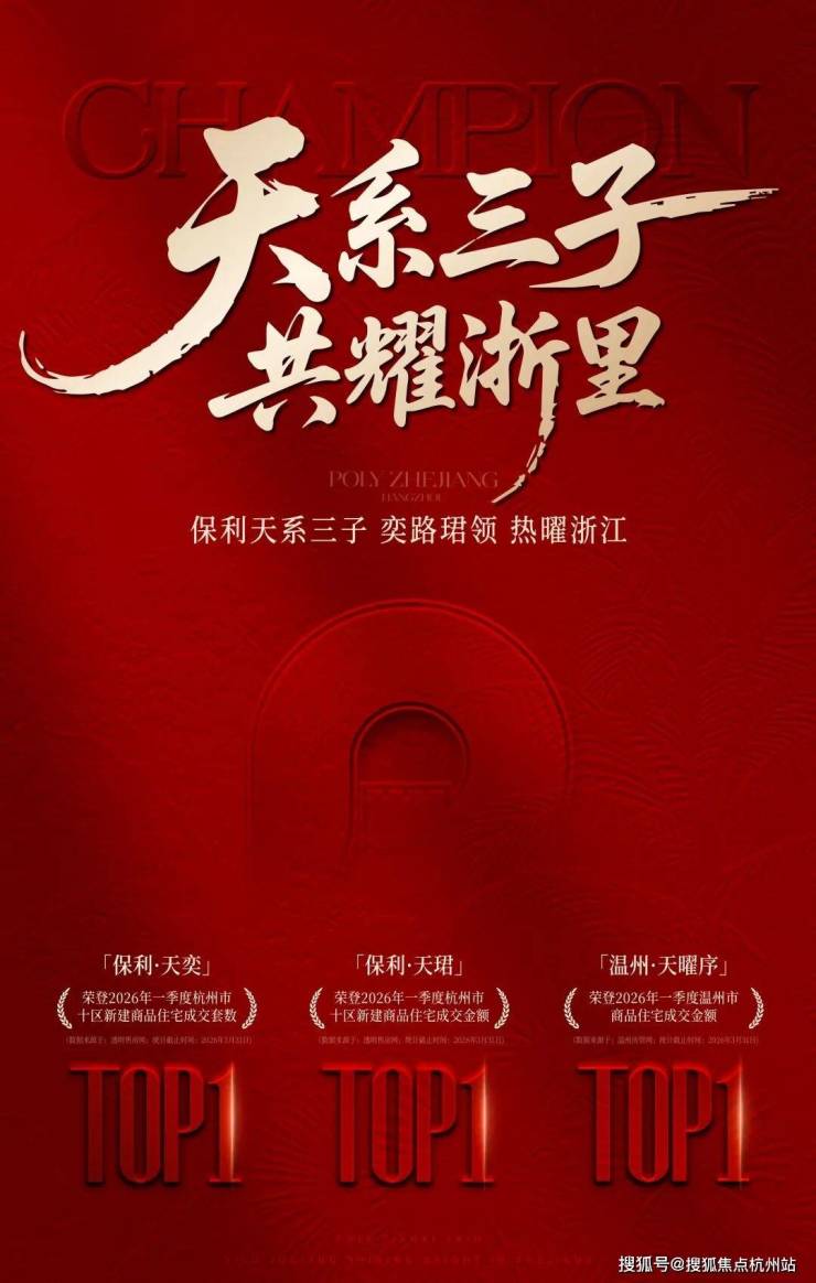 浙江楼市的热度,在一季度房企成绩单中得到了集中体现。2026年一季度,保利发展在浙江区域交出亮眼成绩单:杭州天奕、天珺项目分别斩获杭州十区商品住宅成交套数榜首和成交金额榜首(数据来源于:透明售房网;统计截止时间:2026年3月31日),温州天曜序项目登顶当地成交金额榜首(数据来源于:温州房管网;统计截止时间:2026年3月31日),呈现“杭州双冠、温州单冠”的热销态势。这既是区域市场回暖的缩影,也折射出头部央企在产品与战略上的精准发力。