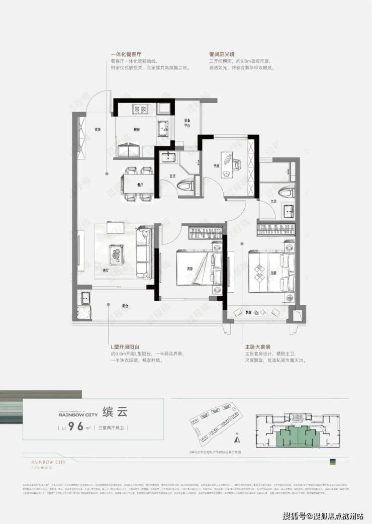 像建面约96㎡户型,整体三开间朝南设计,约9.8m奢阔尺度,户型方正大气,明亮通透,动静分区,再加上约6.6米开阔L型阳台,轻松实现一半洗衣晾晒、一般诗意生活的美妙画境。