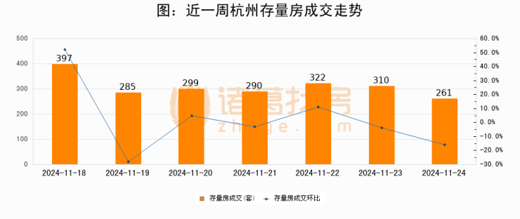 从存量房来看,2024年11月24日杭州存量房单日成交261套,比昨日减少49套,环比下降15.8%。从近一周存量房成交来看,杭州存量房日均成交套数为309套,11月24日单日成交261套,低于近一周平均水平15.5%。