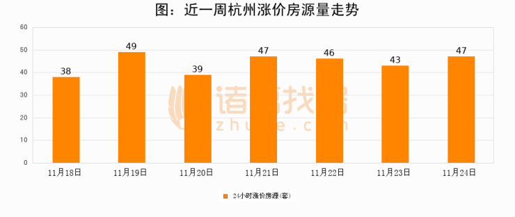 根据诸葛找房数据显示,杭州24小时涨价房源量为47套,较11月23日增加4套,环比上涨9.3%。与此同时,涨价房源占比小幅扩大,业主信心有所提升。