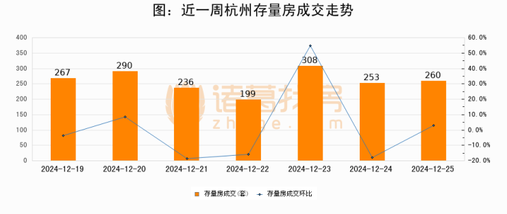 从存量房来看,2024年12月25日杭州存量房单日成交260套,比昨日增加7套,环比上涨2.8%。从近一周存量房成交来看,杭州存量房日均成交套数为259套,12月25日单日成交260套,高于近一周平均水平0.4%。