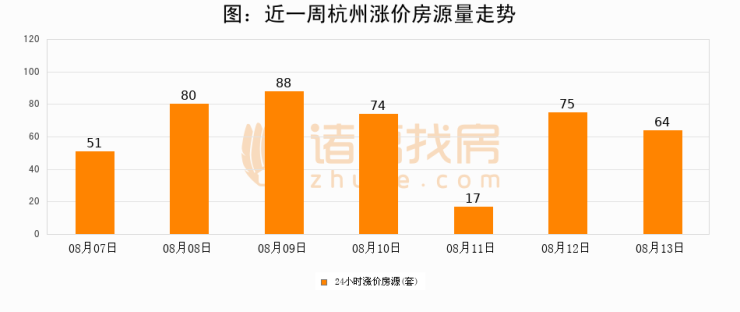 根据诸葛找房数据显示,杭州24小时涨价房源量为64套,较08月12日减少11套,环比下降14.7%。与此同时,涨价房源占比小幅回落,对于购房者来说是一个入市窗口期,购房者可抓住时机入市。