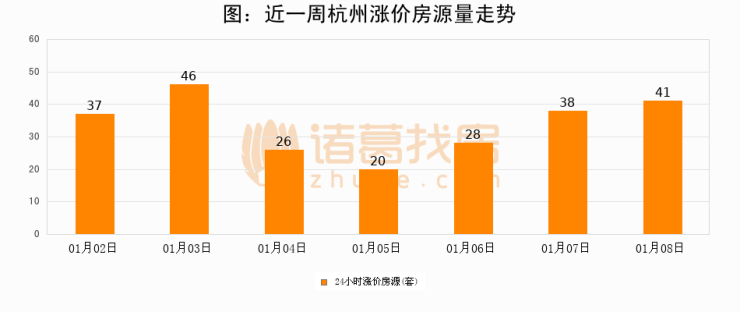 根据诸葛找房数据显示,杭州24小时涨价房源量为41套,较01月07日增加3套,环比上涨7.9%。与此同时,涨价房源占比小幅扩大,业主信心有所提升。