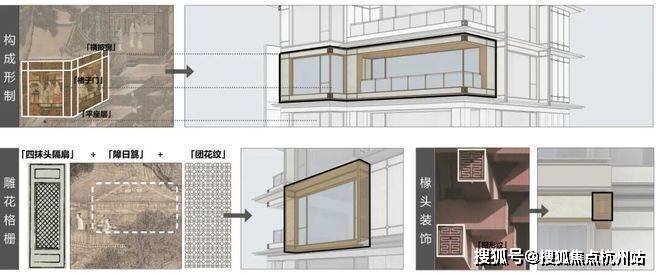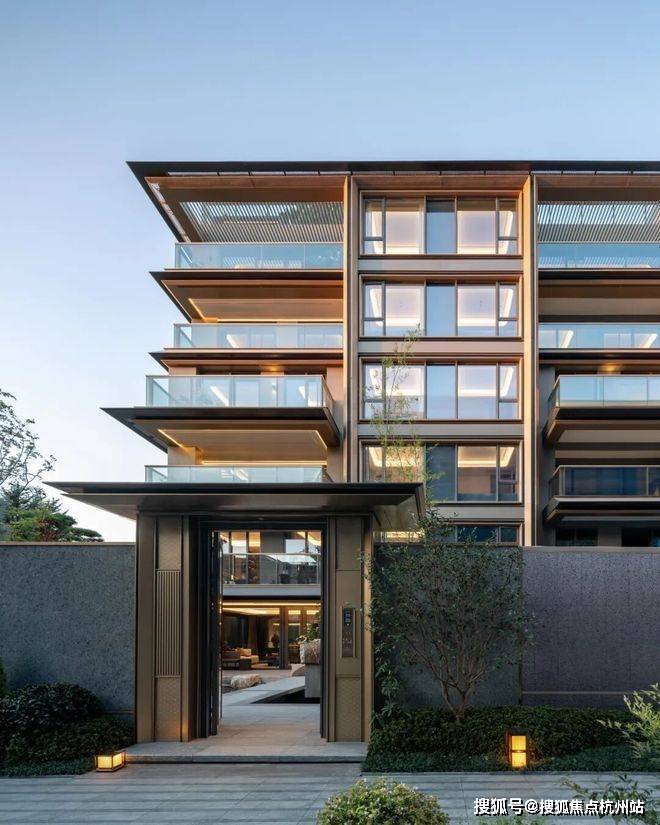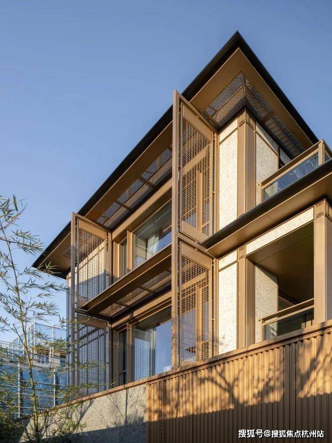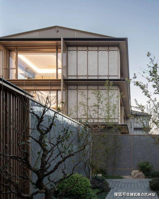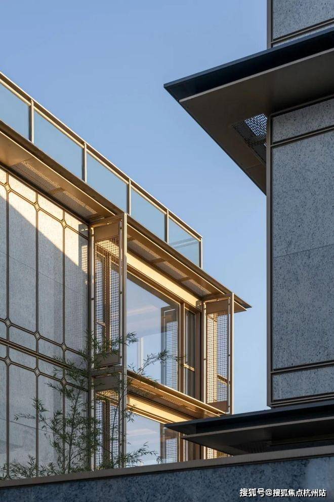 立面设计以“现代形制,东方意境”为笔法。合院立面汲取传统“平座上建屋”的形制逻辑,以深色石材基座构筑沉稳体量;浅色石材作载体转译格子门与横披窗的构成逻辑。细部处理上,将东方建筑符号转化为现代建筑语言:歇山顶山花处的悬鱼构件成为空中的雅致点缀;转角嵌饰回形纹椽头,将结构之美凝练为精致符号;雕花格栅源自宋代传统门窗的四抹头隔扇,以其通透特质引光入画,赋予建筑随时间流转的光影表情。叠墅立面则采用斜边框挑檐造型与舒展的水平线条,塑造出轻盈优雅的建筑形态,与东沙湖宁静开阔的景致相呼应。