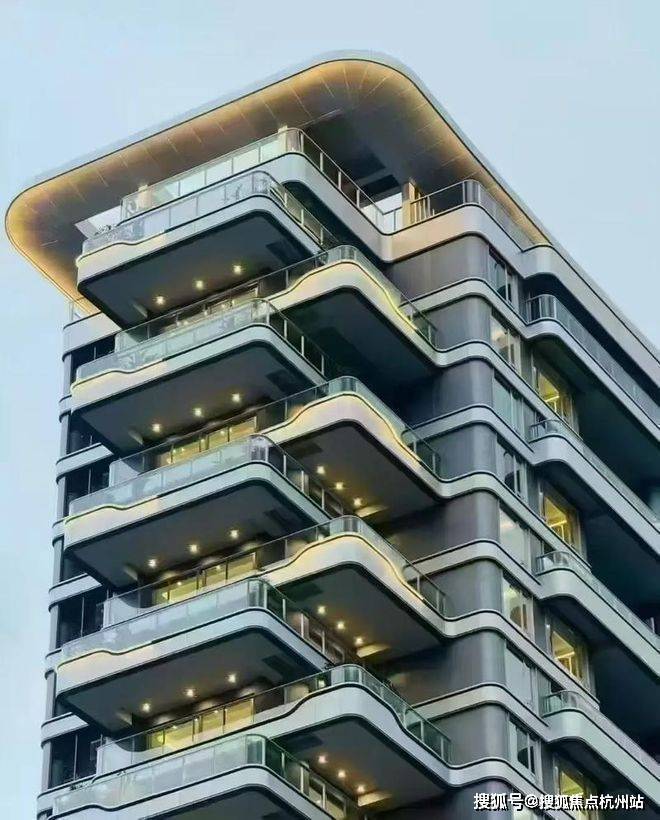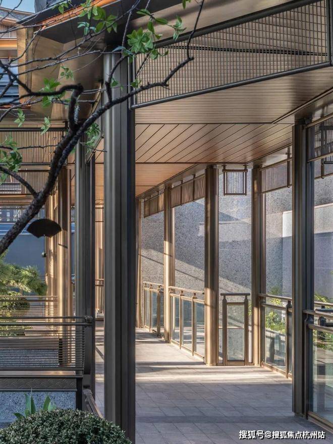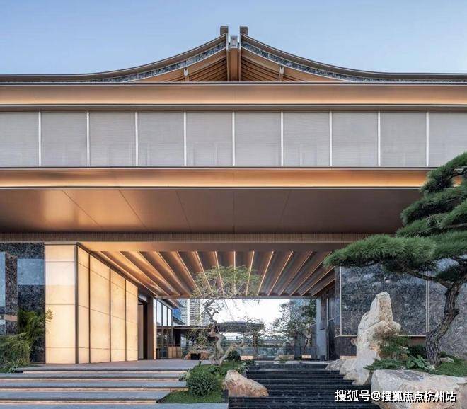 公区外立面取意于形、会意于神。设计师将住区主要入口以不对称的曲面坡顶统领全局,在捕捉宋代屋顶的灵动气韵的同时,亦暗合钱塘江潮的韵律。提炼中式建筑椽头、山花等元素,以现代设计语言重构,纤毫毕现。既延续传统形制意趣,又赋予其现代建筑的简洁张力。
