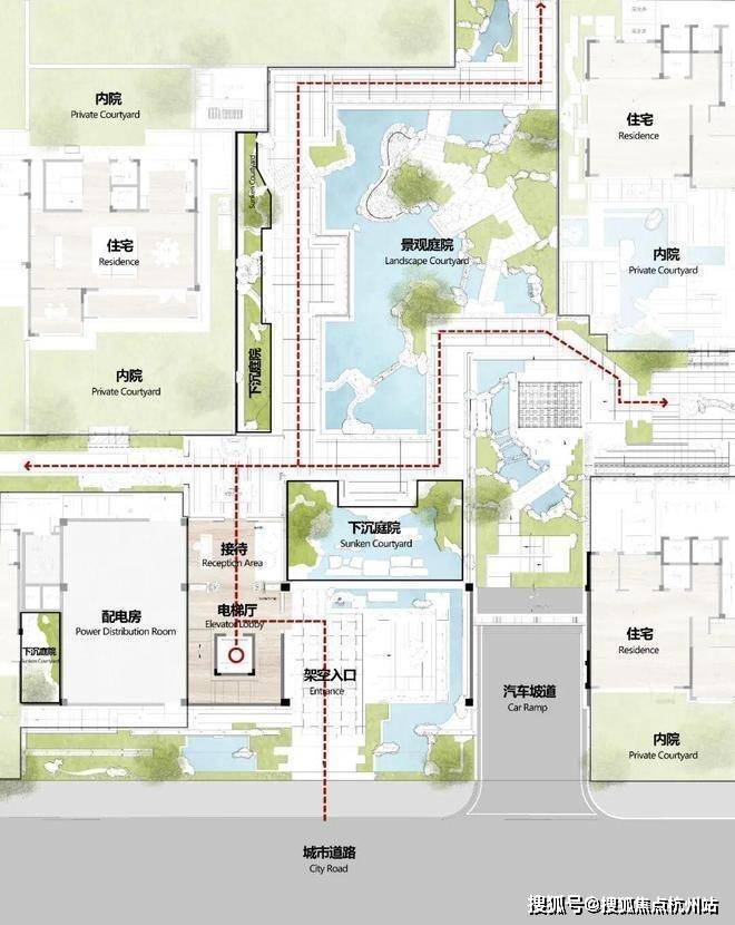 小区用地捉襟见肘,如何将公区功能合理置入紧张的用地之中是设计难点。设计巧妙地通过底层架空的方式,把主要功能空间设置于二层及地下室。底层抬升处自然形成了入口灰空间,视觉可透过水幕窥见园内景致,营造景观外溢感,释放地面空间并强化入口通透感。同时,借场地高差在坡道上部构建层级景观,与中心庭院形成视觉、流线的衔接,以 “小中见大” 手法打造丰富游览序列。