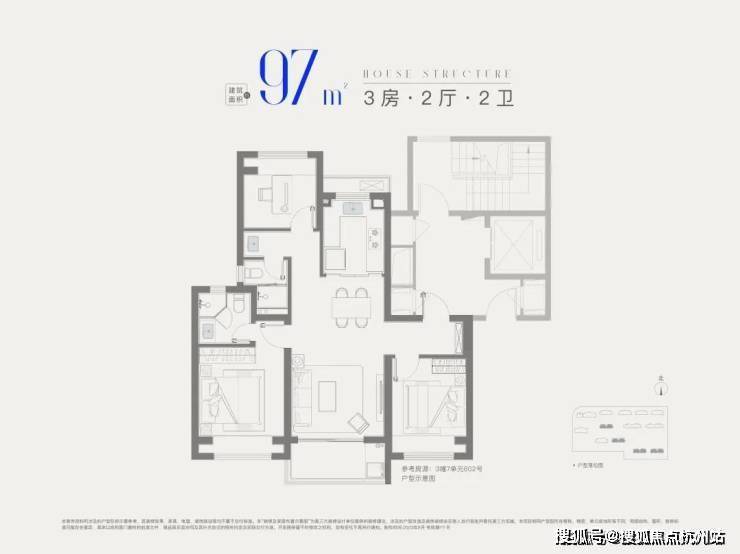 建面约97㎡3房2卫, 升级版大3房,入户玄关+主卧套房设计 ,整体私密性更强,空间更为宽敞。