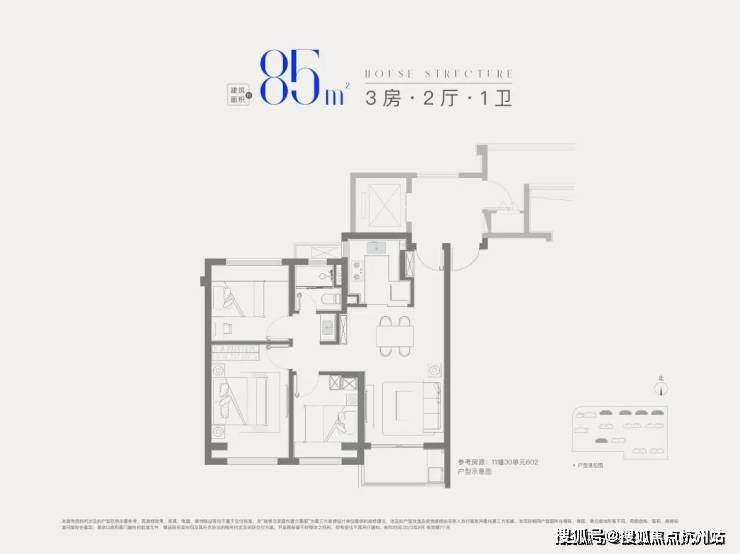 建面约85㎡3房1卫,做到 三开间朝南+全卧室带飘窗+卫生间干湿分离 +动静分离,非常紧凑的小3房。
