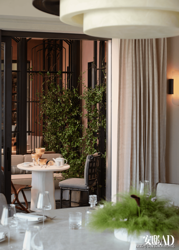 以超白玻璃引入的静谧光景,打破围合式会所的物理边界,设计师通过落地窗景与下沉式庭院的景观联结,以采光和风景实现了地下会所空间的地上化,照抚人类渴望身处自然静谧的精神本能。