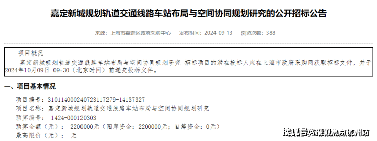 9月13日,上海政府采购网发布《嘉定新城规划轨道交通线路车站布局与空间协同规划研究的公开招标公告》。