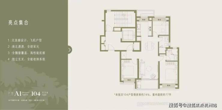 建筑面积约104㎡三房:入主滨江的优质之选:采用“几乎无连廊”设计,保障隐私与通透;三开间朝南,客厅衔接观景阳台,主卧自带独立卫浴;独立八百库玄关+全能收纳系统,让小家庭的日常整洁有序,对比周边11-13.5万/㎡的新盘,性价比优势显著。