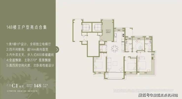 建筑面积约148㎡阔尺四房:高阶改善的奢居范本:类1梯1户设计,全明独立电梯厅营造归家仪式感;近14米南向面宽+四开间朝南,餐客厅一体化社交空间贯通景观阳台;内外双玄关+步入式储藏间,解决收纳痛点;主卧套房配270°揽景飘窗,沉浸式享受滨江奢居体验,满足高净值家庭的品质需求。