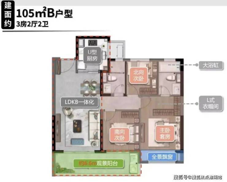 105㎡三室两厅两卫:经典竖厅设计,南向双卧+客厅三开间朝南,U型厨房连接生活阳台,总价约278万起。该户型动静分区明确,主卧套房设计,适合年轻三口之家