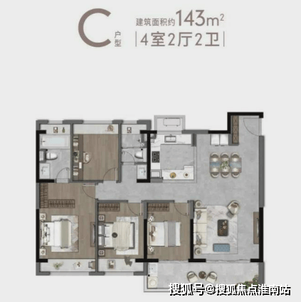 143㎡四室两厅两卫:双套房设计,老人房与儿童房分居两侧,南向双阳台总长超8米。厨房配置中西双厨,餐厅可容纳10人圆桌,总价约379万,适合多代同堂家庭