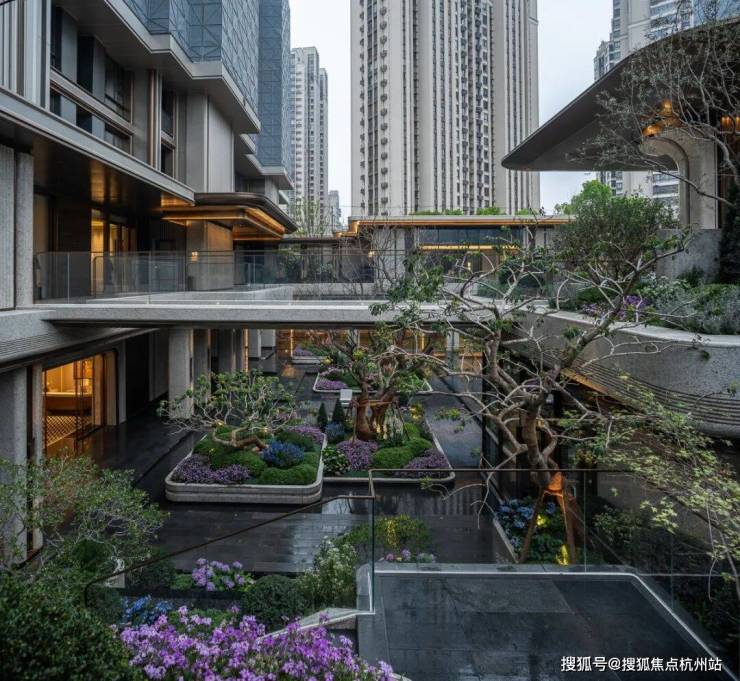 芳汀花园:核心水景用了宇宙黑金奢石,纹理深邃如星云,配上四株对称的香橼树,这种“对称美学”极其治愈。