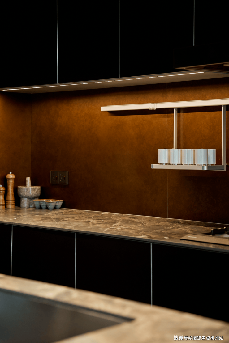 西厨岛台选用亚马逊绿大理石纹岩板打造,搭配金属质感推拉门,高审美艺术性表现力满分!