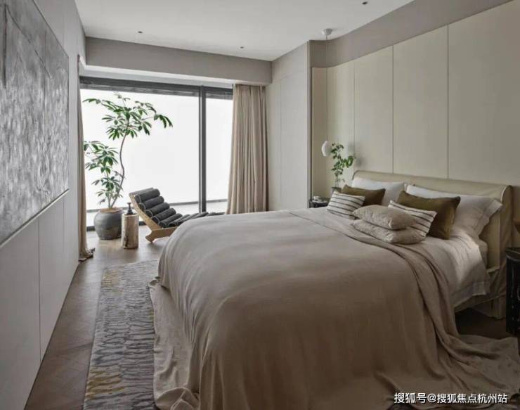 次卧背景墙采用米色和灰色硬包布料组合,搭配弧形墙面处理,品质感满满。