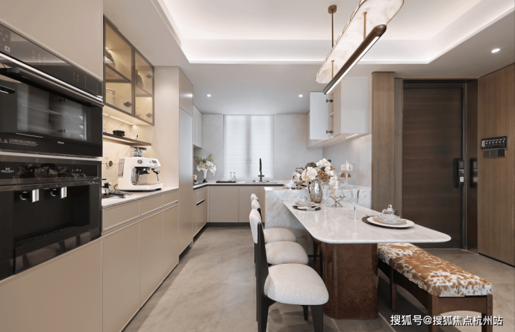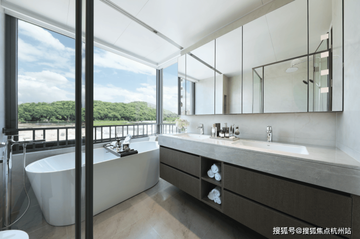 公建化的立面,四面铝板搭配大面积玻璃,阳台统一封包,底层的浅色天然石材还被打磨出弧线,脱去厚重外壳,轻盈洒脱。项目西侧直线约800米就是钱塘江,春来晴翠也在园区里编织了一幅山水画卷。
