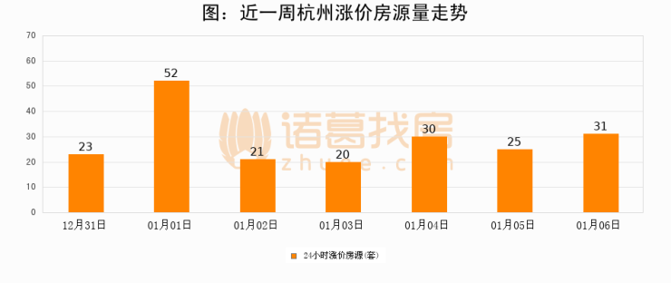 根据诸葛找房数据显示,杭州24小时涨价房源量为31套,较01月05日增加6套,环比上涨24%。与此同时,涨价房源占比小幅扩大,业主信心有所提升。